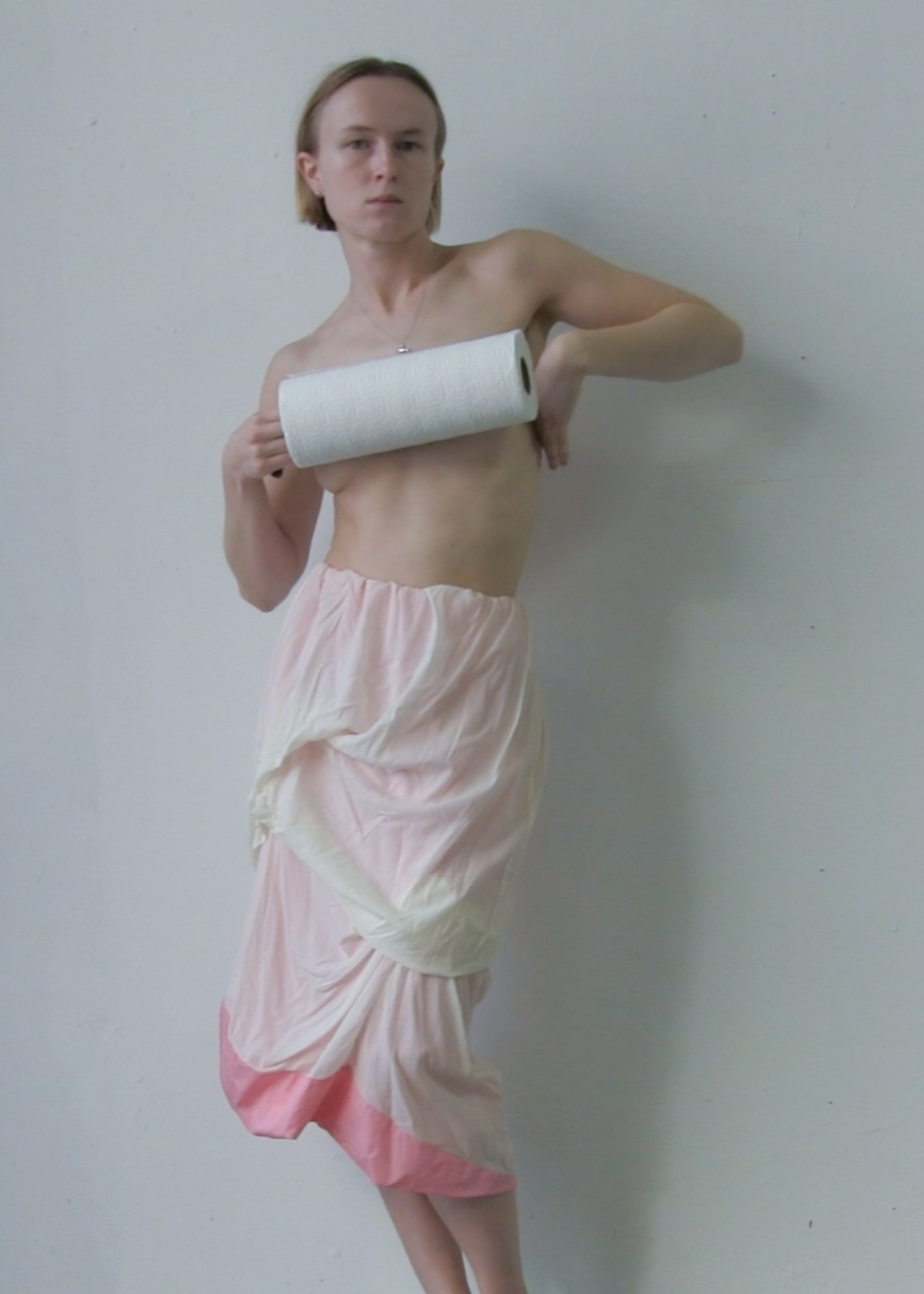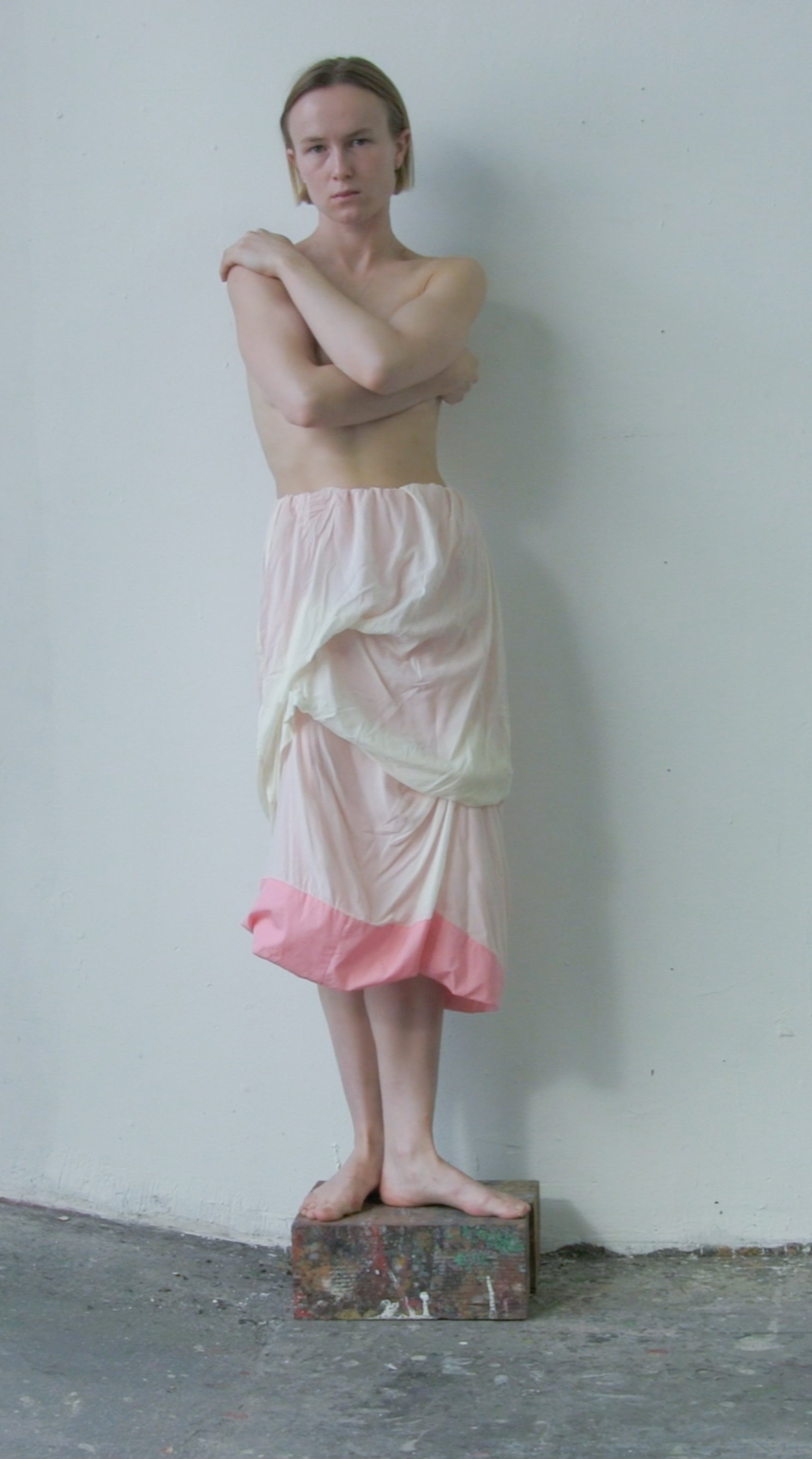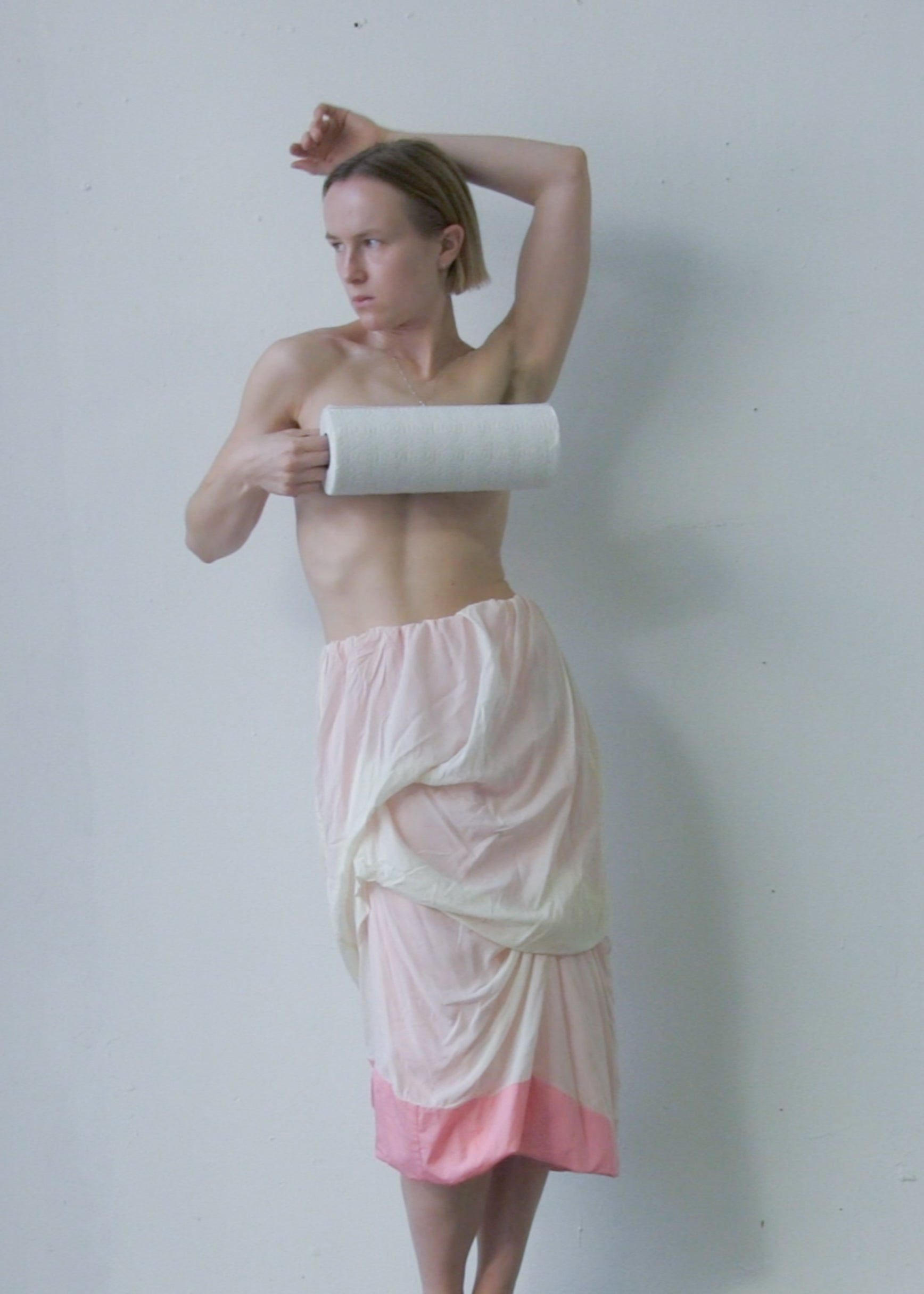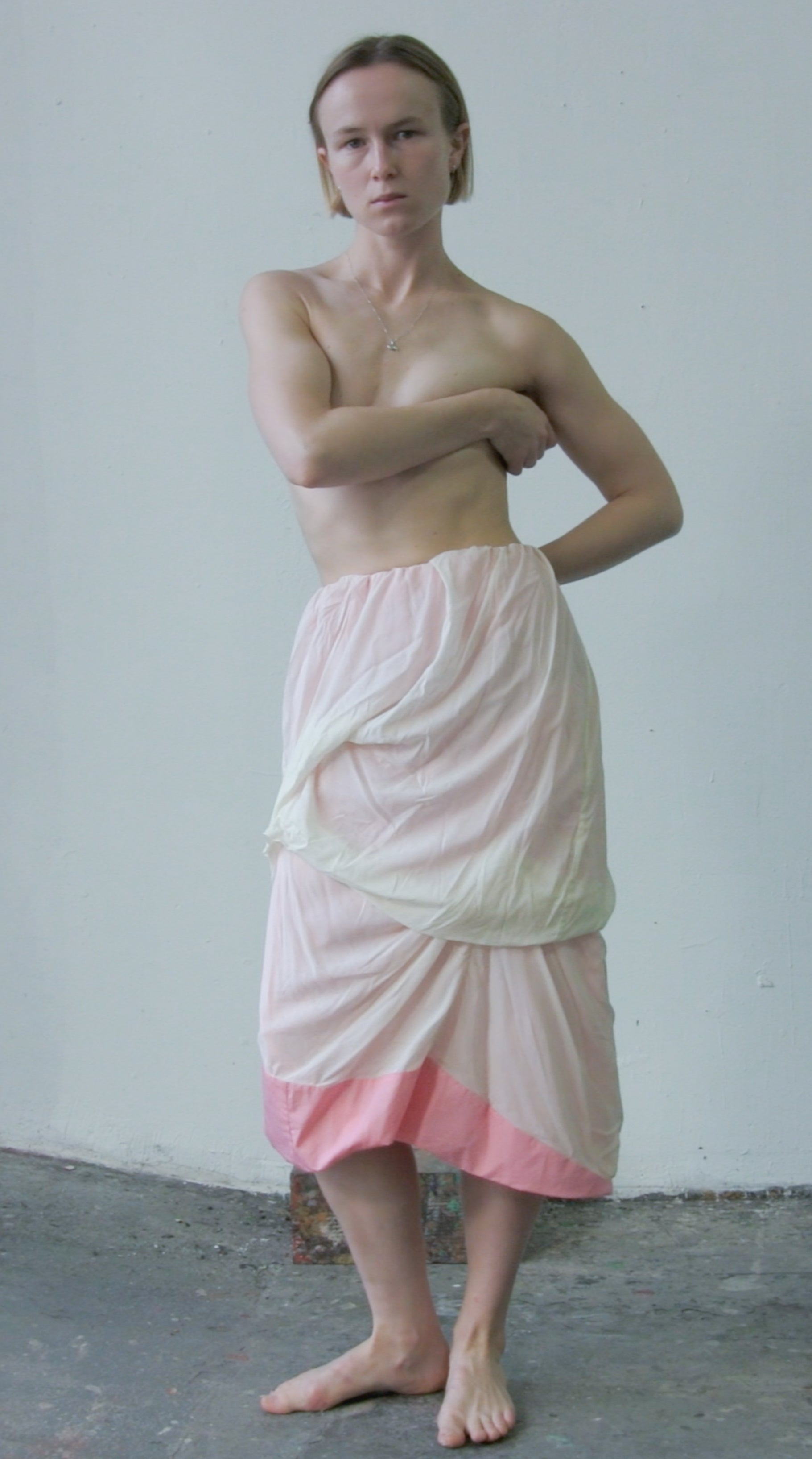one-of-a-kind skirt made out of a off-white transparent silk/elastane mix voile and a pink 100% cotton lining, showing through and popping out at the hem. All fabrics are from dead-stock.